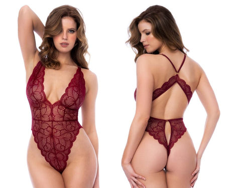 The most flattering bodysuit in a cotemporary wavy lace. Features a plunge neckline, open back design and adjustable crotch fastening.